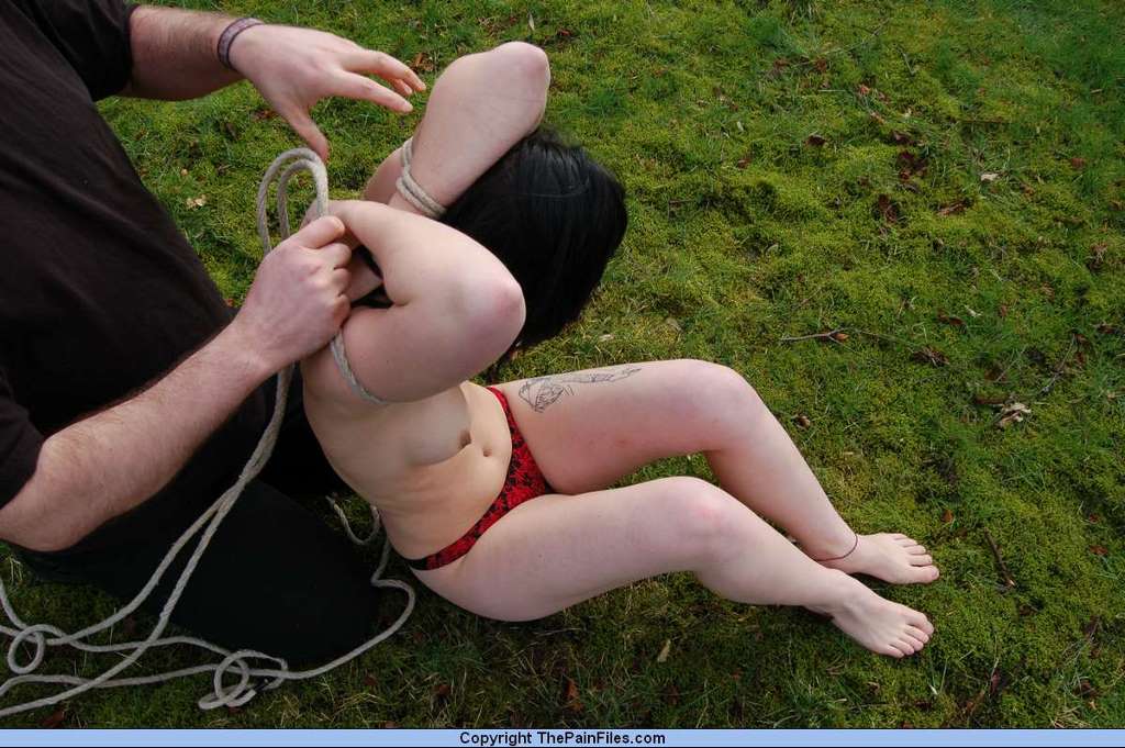 PIXIES OUTDOOR NAKED BONDAGE Hot fucking nasty slut Slavegirl Pixie was naked outdoors when she and her master took a short nature walk outside. Then her master made her sit on the grass and tied the bitch up arms around the back of her head.